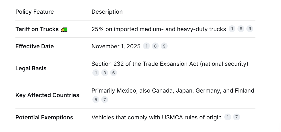 2.Phạm vi và tác động: Mức thuế 25% áp dụng cho tất cả các xe tải hạng trung và hạng nặng nhập khẩu (thường là loại trên 6 tấn hoặc 10.000 lbs).